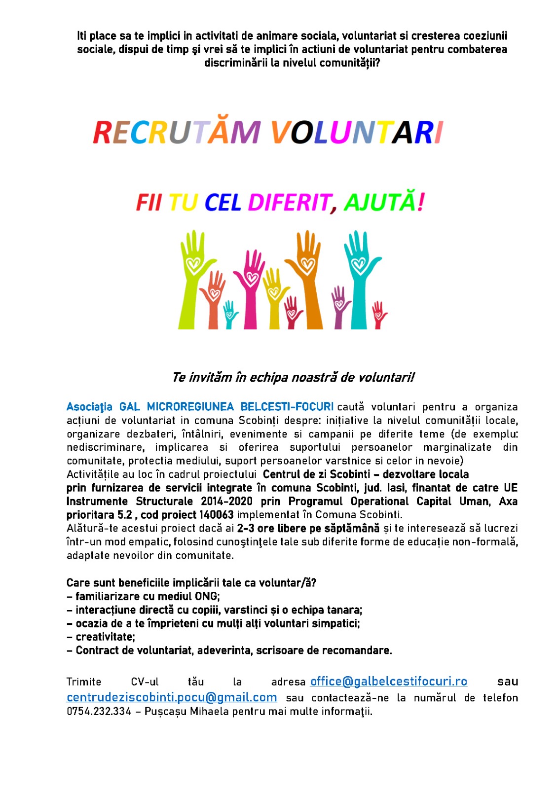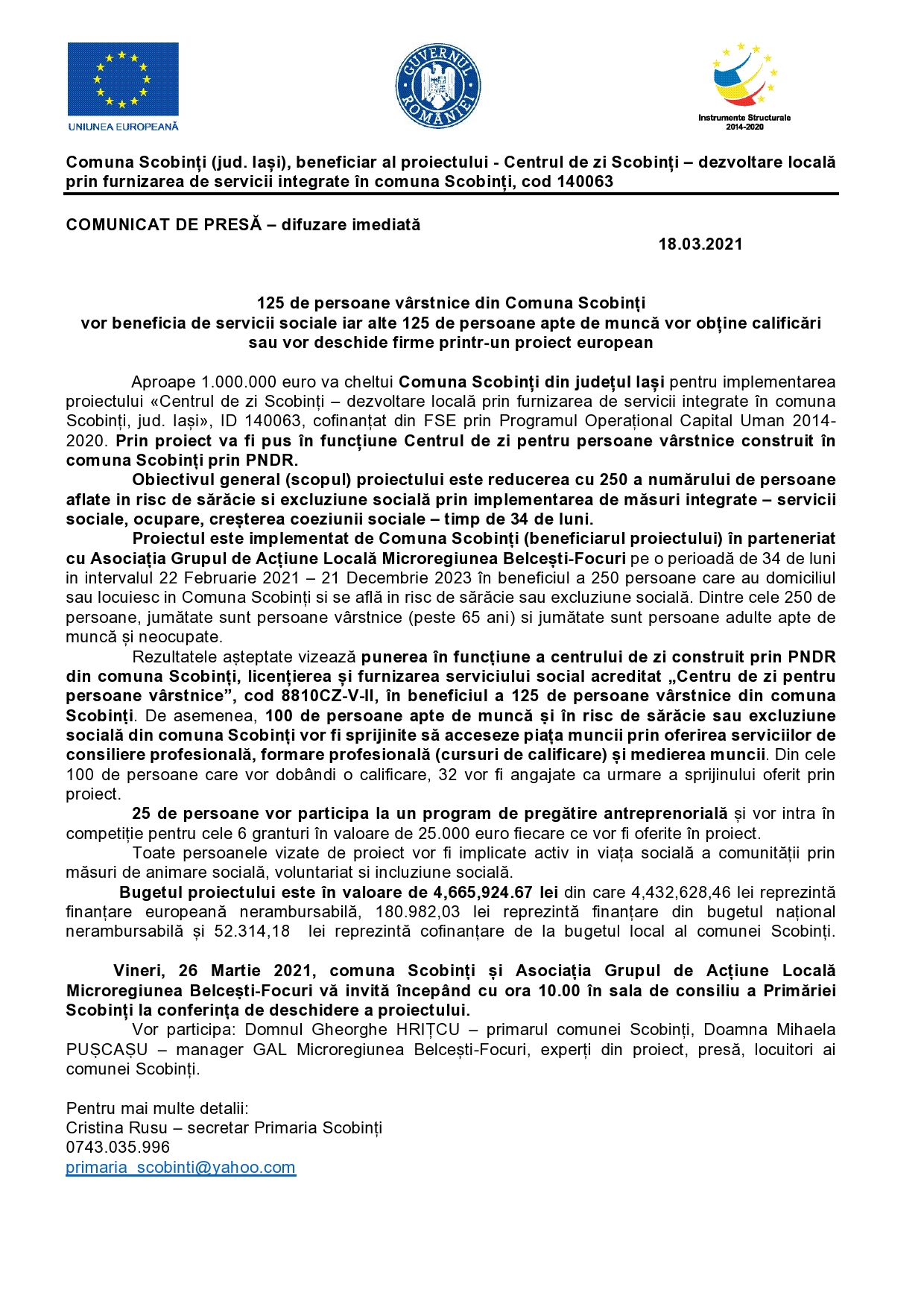 Proiect cofinanțat din FSE prin Programul Operațional Capital Uman 2014-2020, cu titlul «Centrul de zi Scobinți – dezvoltare locală prin furnizarea de servicii integrate în comuna Scobinți, jud. Iași»